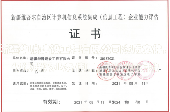 新疆維吾爾自治區計算機信息系統集成企業證書
